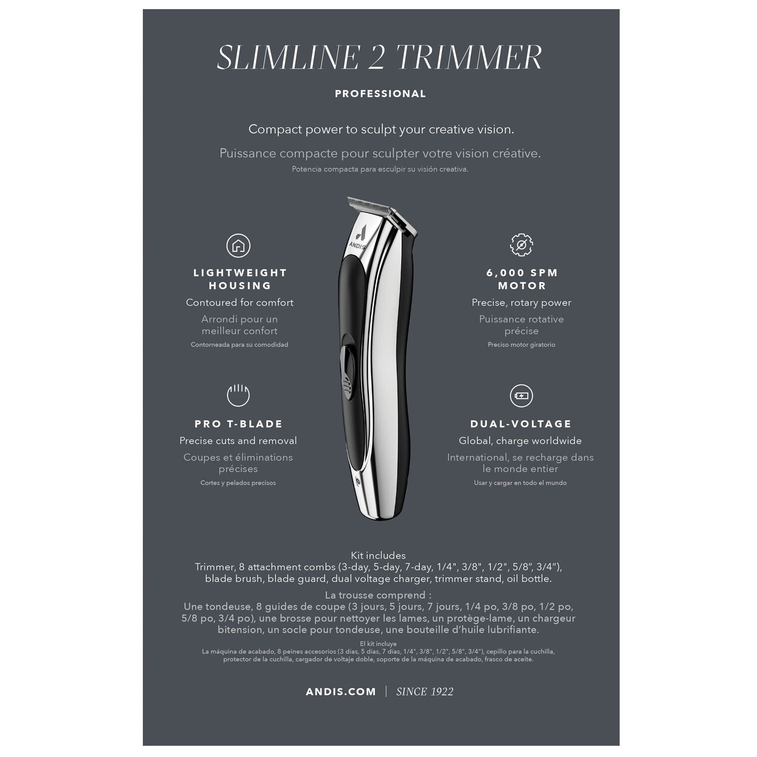 Be ready for your next big breakthrough no matter where you are with the Slimline® 2 Trimmer, thoughtfully designed. A mere 4.5 oz, this ultra-lightweight trimmer includes a dual-voltage charger for international adventures. Refine necklines, sideburns, and facial hair with extra-sharp, stainless-steel T-blades and eight premium attachment combs. Forge ahead with the long-lasting battery or use with the included charge cord so nothing interrupts your flow. Keep your creativity alive from anywhere in the world with the Slimline 2 Trimmer.