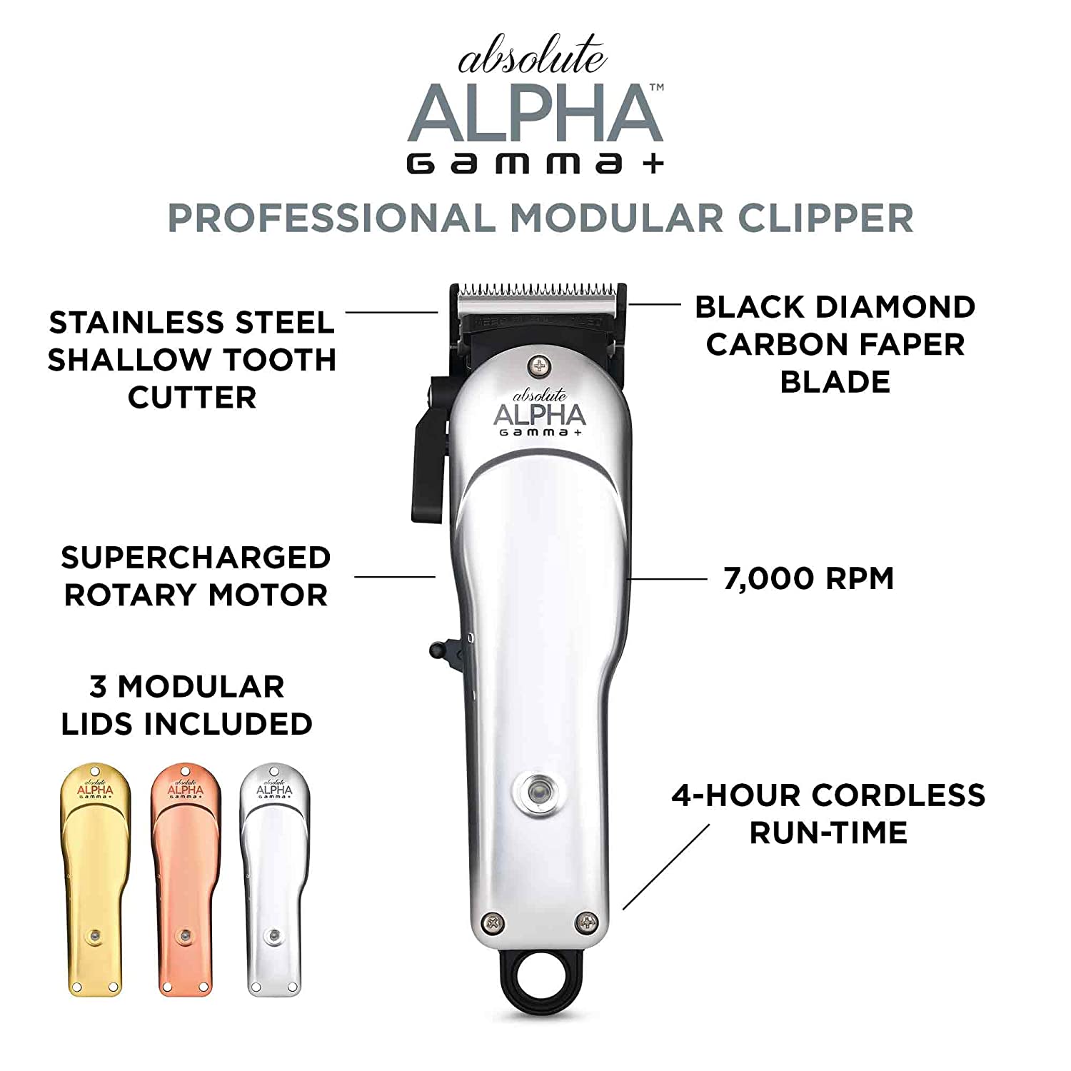 The Absolute Alpha features supercharged rotary motor that is more powerful, quieter, and lighter weight than similar clippers in its class. The Alpha not only includes a stand and magnetic guards, but is assembled with a universal modification bracket with 4 holes, for use with almost any other fixed blade.
